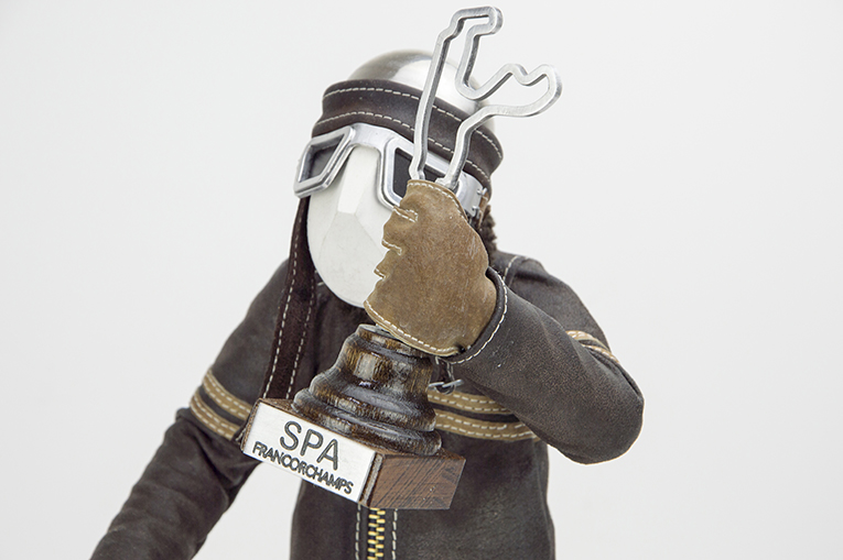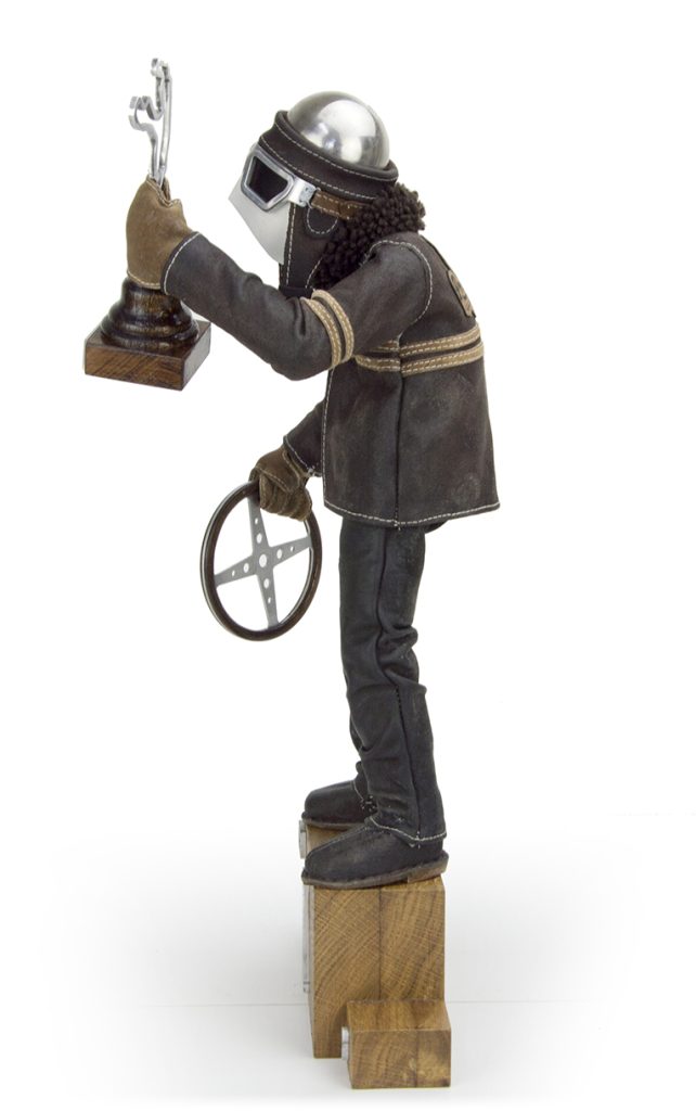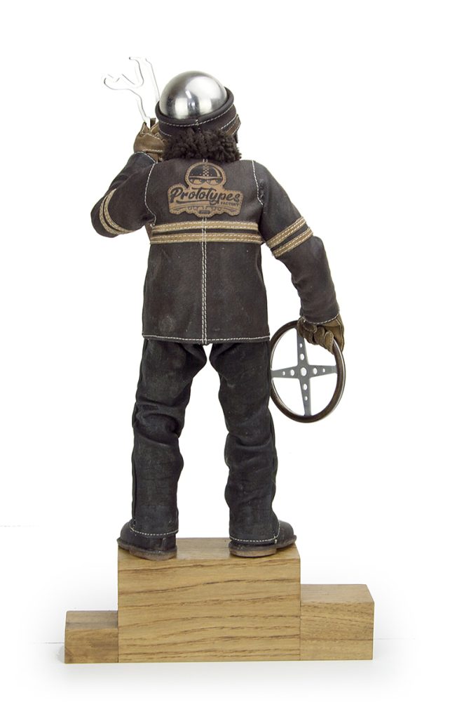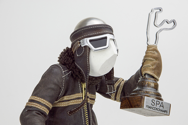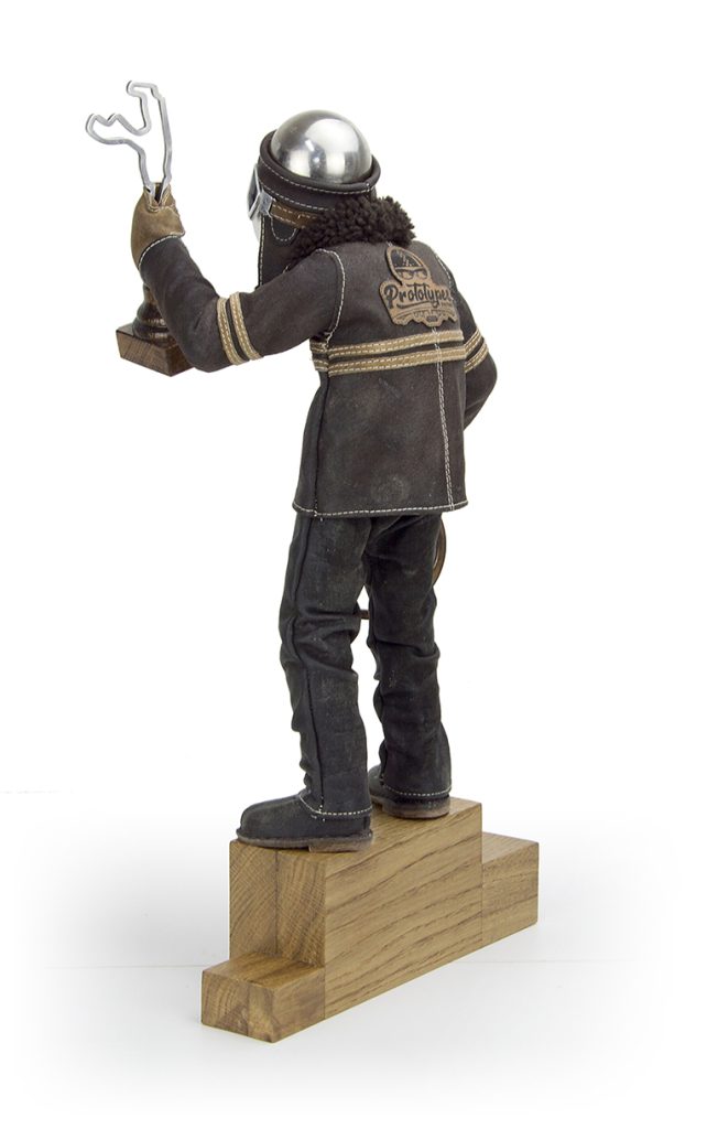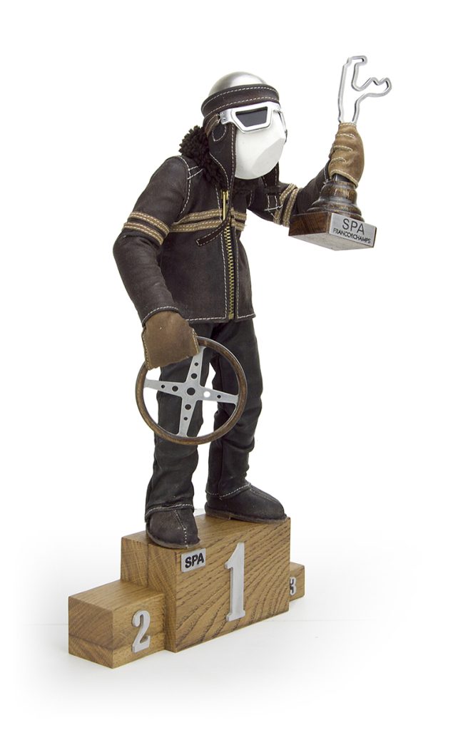Un fier pilote d’un kilo deux cents qui a oublié d’enlever son casque sur le podium. Un ensemble constitué de pièces usinées en CNC comme la coupe, les chiffres, les lunettes et le volant, le tout en aluminium. Le personnage est en bois et les habits en cuir.