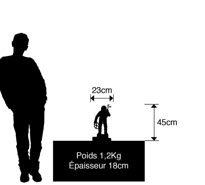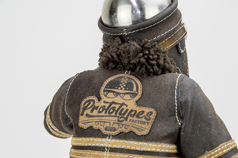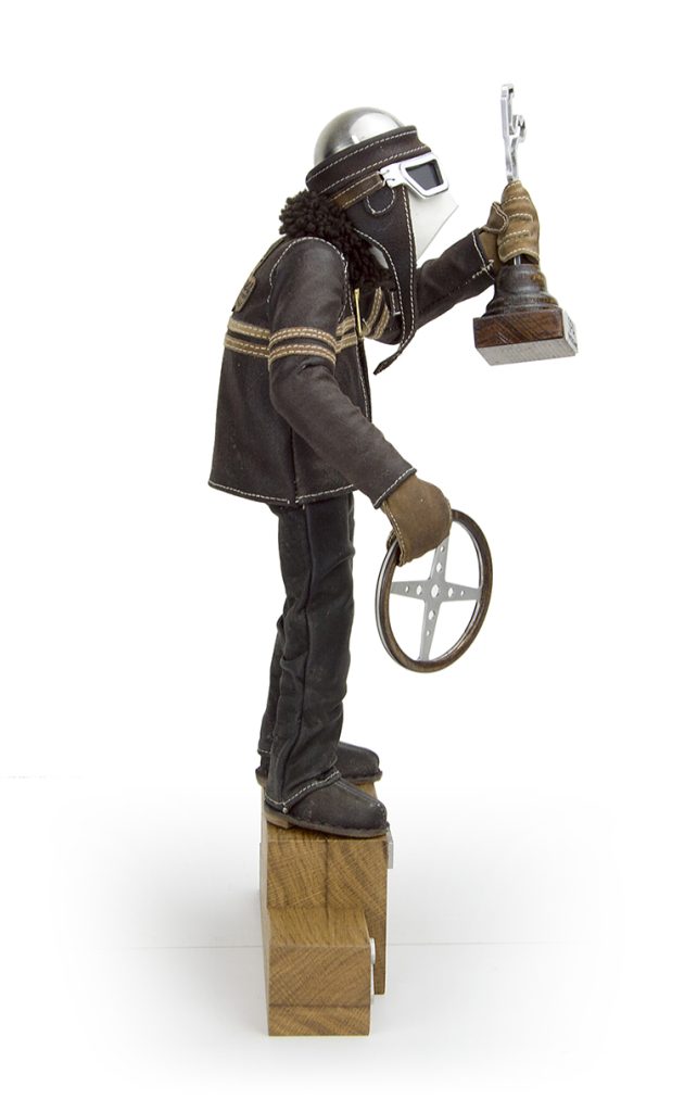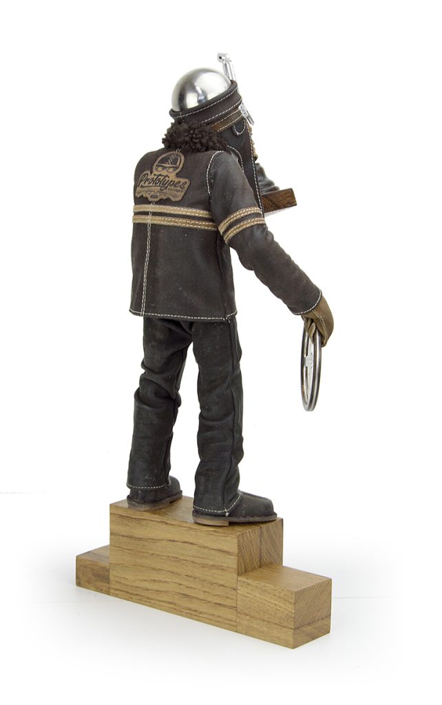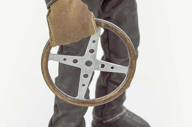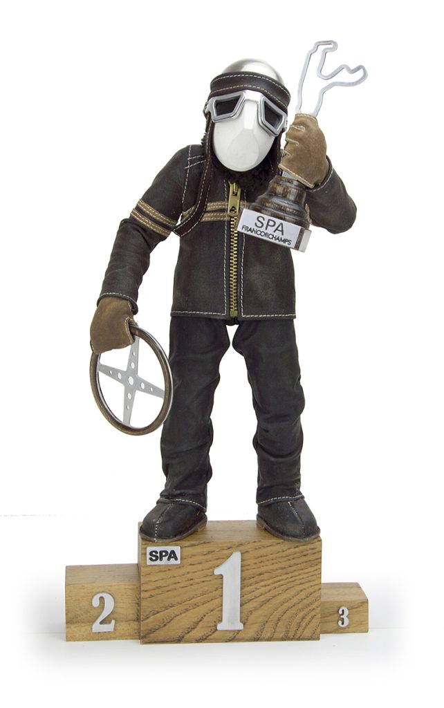 Un fier pilote d’un kilo deux cents qui a oublié d’enlever son casque sur le podium. Un ensemble constitué de pièces usinées en CNC comme la coupe, les chiffres, les lunettes et le volant, le tout en aluminium. Le personnage est en bois et les habits en cuir.